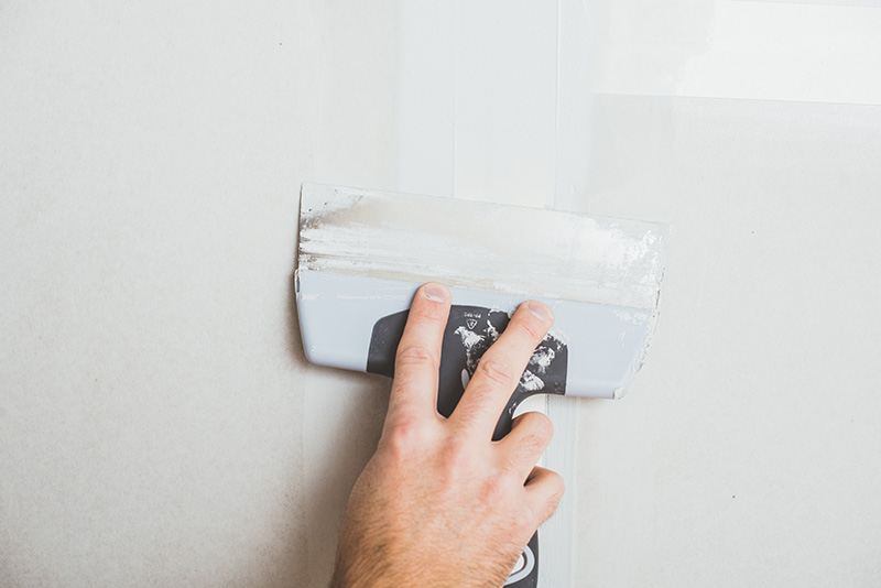 Then apply jointing tape over the joints, to prevent the plaster from cracking. Use one of the wide filling knifes to hold the paper strip in place, and a seam and joint filling knife (or the other filling knife) to secure the strip in place with even pressure. Then apply a new, thin layer of plaster over the paper strip, also covering screw holes and other imperfections. Then let theplaster dry, preferably until the next day.