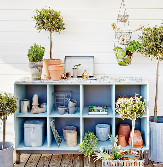 We took paint and tiles and created a practical workbench with good storage and space for planting plants.