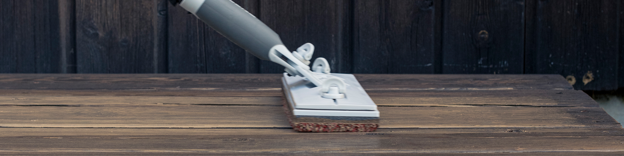 Make sure your terrace is clean and dry before sanding. Attach sanding paper to a hinged sanding tool and sand away any raised fibres, splinters and irregularities from the wood. There are different grits of sanding paper and for the terrace 120 grit is usually adequate.