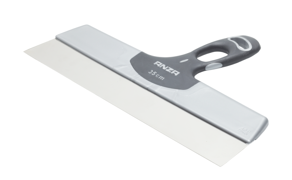Are you going to paint or wallpaper a surface that has holes or imperfections? In this case, you need to use a wide filling knife to fill the gap first. Ergonomically designed and held in a paddle grip for optimum control, this rubberized handle has a patented thumb hole to allow you to get an extra good grip on the filling knife without overexerting your hand. Can also be extended using our wide filling knife holder and extension pole for extra reach. When plastering, use two wide filling knifes, a smaller one to fit in the bucket and a wider one for spreading.